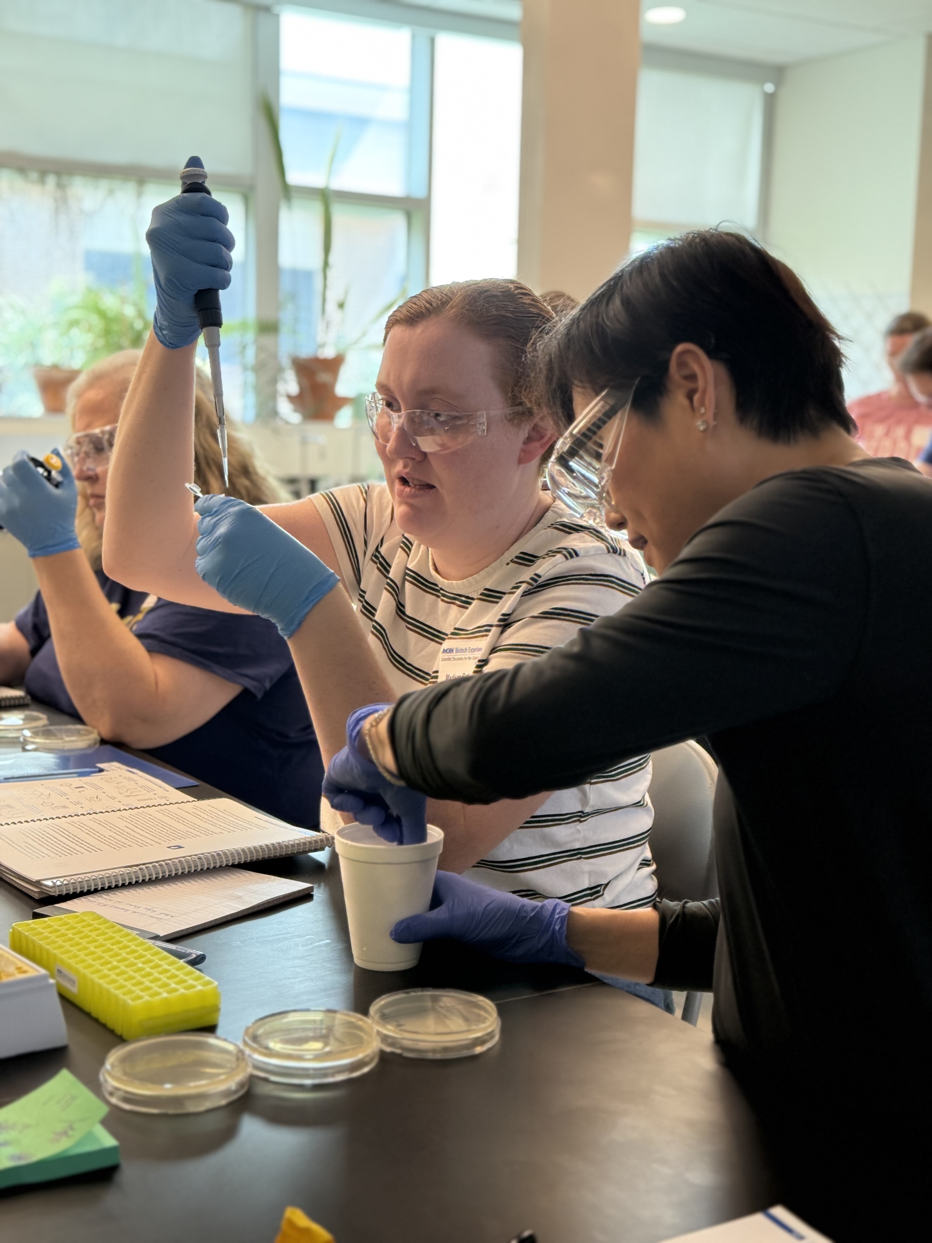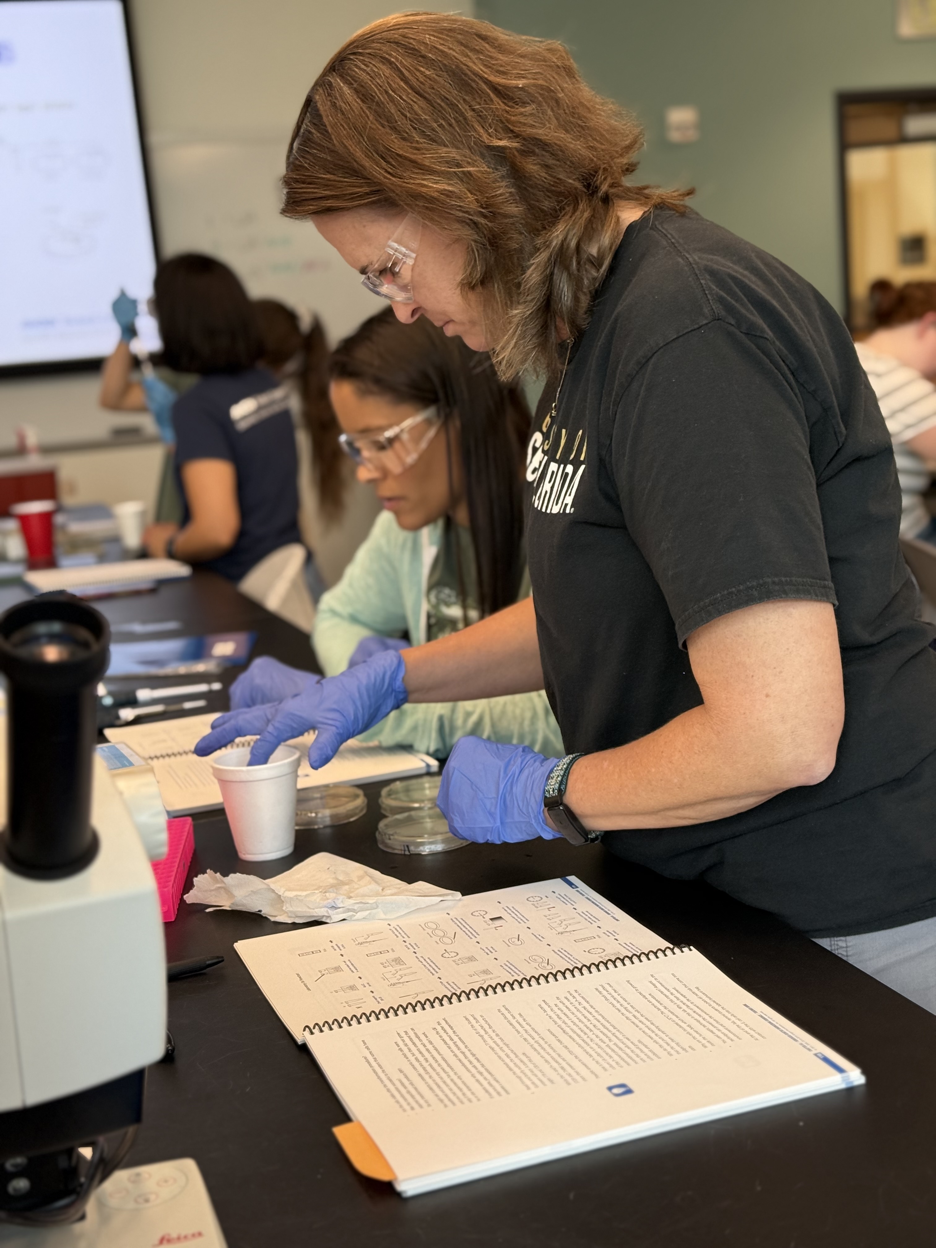 On September 22, the Returning Teacher PDI welcomed eight experienced ABE educators for a hands-on training session that was built upon previous ABE training. The workshop introduced an exciting new lab: Colony PCR, where students will use PCR techniques to confirm the presence of a target plasmid. Teachers expressed strong enthusiasm for this addition, with many eager to bring the new lab into their classrooms. The session also included a preview of an upcoming series of labs focused on exploring precision medicine, offering a glimpse into future expansions of the curriculum. These new labs are designed to deepen students' understanding of molecular biotechnology and enrich their learning through real-world applications. Throughout the day, returning teachers refined their skills, exchanged classroom strategies, and explored innovative lab practices, strengthening both their technical expertise and instructional approaches within the ABE community.